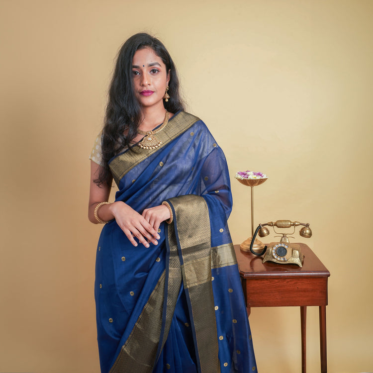 ASHWATHI - Ink Blue Cotton Silk Maheshwari Saree with Floral Motifs